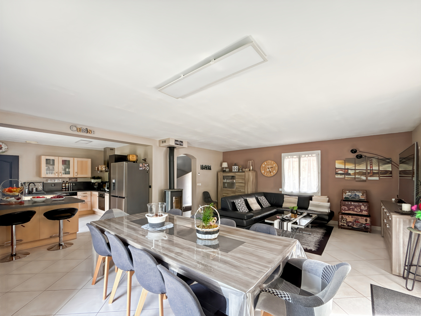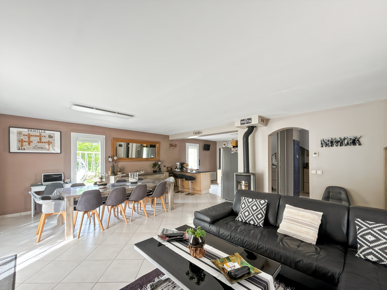 Au rez-de-chaussée, l’entrée équipée d’un placard mène à un séjour spacieux et lumineux comprenant un salon avec poêle à bois, une salle à manger et une cuisine ouverte aménagée-équipée. L'ensemble du rez-de-chausée est équipée de volets roulants éléctriques.